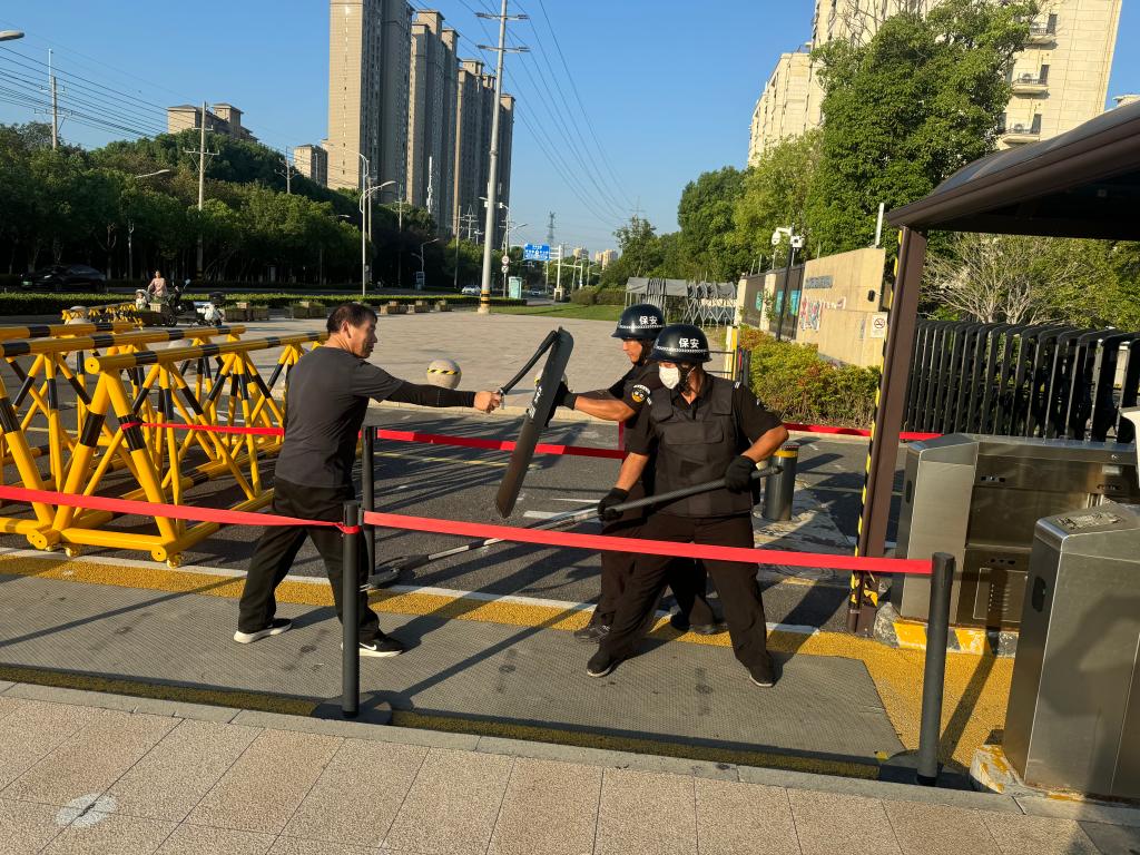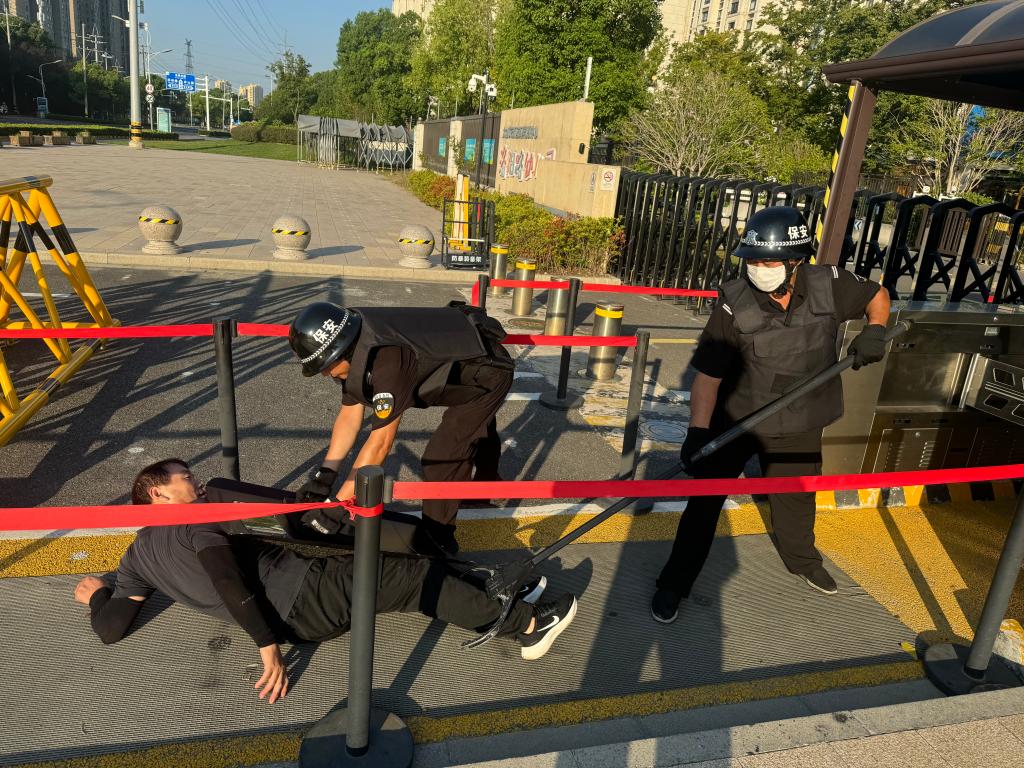 在校园演练中,安保人员沉着冷静手持盾牌、齐眉棍等防护装备,与“歹徒”展开周旋,并立即启动“一键报警”装置,密切配合,成功将其制服。