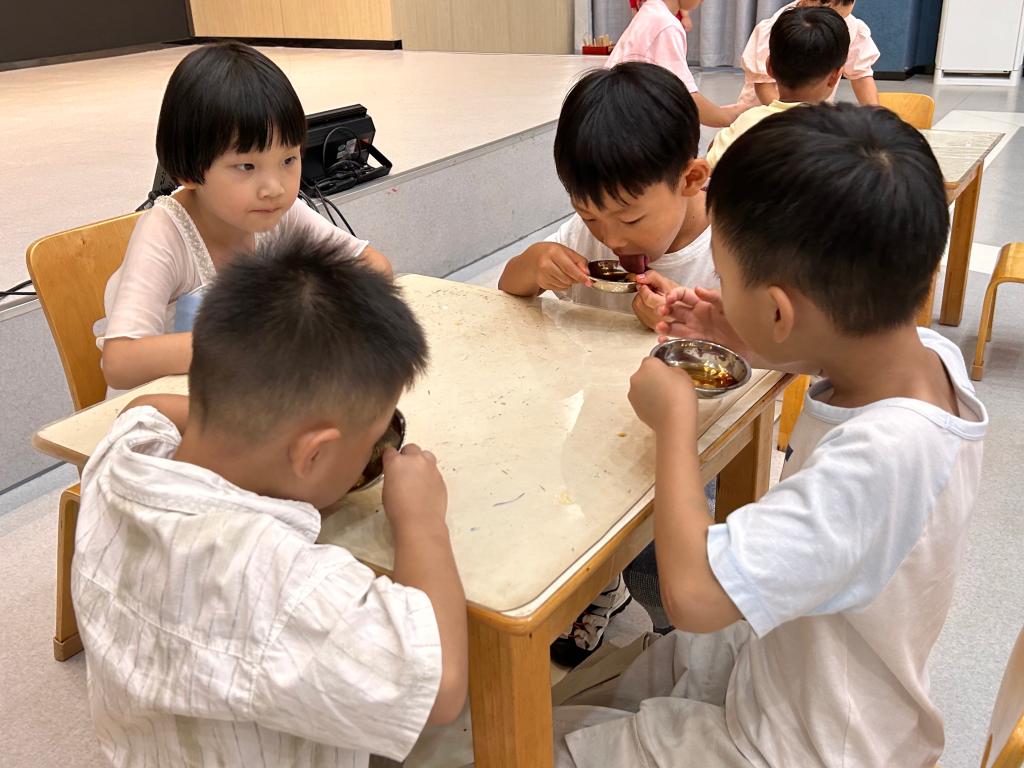 活动现场热闹非凡,丰富的体验环节接连展开。在猜谜区围绕国旗、国庆日期等知识互动孩子们围在灯谜卡片前,你一言我一语地讨论,猜对答案时的欢呼声此起彼伏;手工制作区里,幼儿们在教师的指导下,用红纸和画笔制作国庆主题贴画,;投壶游戏区更是人气高涨,孩子们排队站在指定线后,瞄准壶口投掷箭矢,成功投中时的雀跃模样,让现场充满欢乐气息;在与老物件合影区,旧报纸、老式收音机、算盘等物品吸引了幼儿的目光,幼儿们还与老物件合影,感受时代变迁;美食区中幼儿们在教师和保育员的协助下吃上了好吃的红糖丸子。