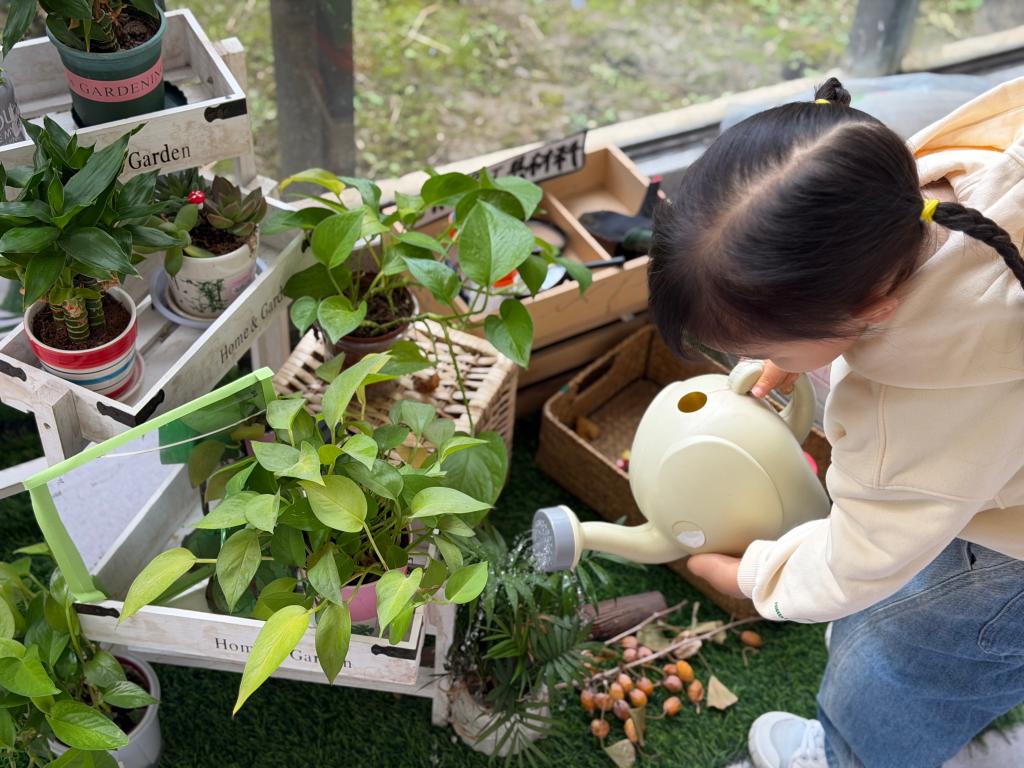 教师可以提供放大镜、透明托盘等工具,引导韵韵观察不同植物叶片(如多肉、薄荷)的触感与水珠停留状态,丰富不同联想,丰富感官体验与联想维度;在自然角设置 “植物小观察” 分享角,鼓励韵韵向同伴讲述“水珠滑滑梯”的发现,提升语言表达与分享意愿;投放彩色卡纸、小绒球等材料,支持韵韵用粘贴、绘画结合的方式,将“水珠玩滑滑梯”的场景表现得更丰富,进一步激发艺术创造兴趣。