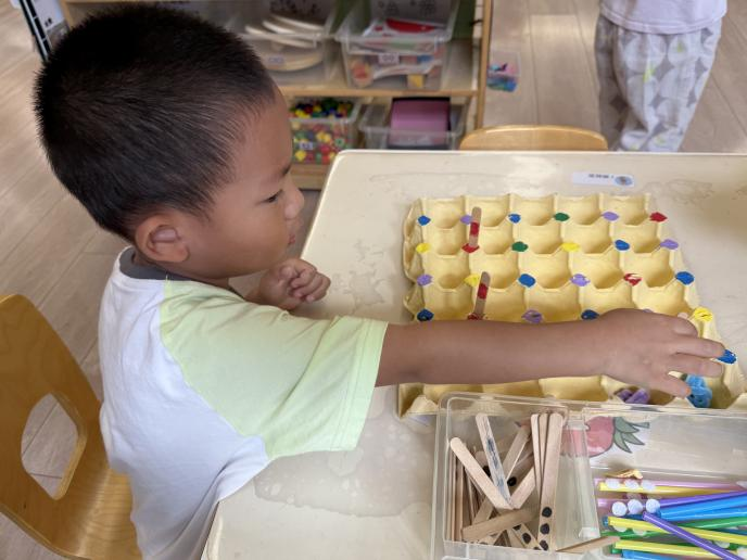 区域游戏时间,皓晨选择了益智区的“好玩的蛋托”游戏材料(黄色蛋托上有不同颜色的圆点标记,搭配彩色小棍、冰棒棍等材料)。他先观察了蛋托上的颜色分布,然后从材料盒中拿起一根蓝色小棍,仔细比对后,将其插入带有蓝色圆点的蛋托凹槽中,完成了一次匹配。接着他又拿起一根红色小棍,精准插入红色圆点的凹槽。