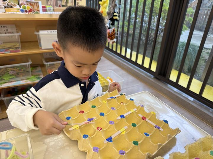 区域游戏时,煦煦选择了益智区的“好玩的蛋托”游戏材料(带有彩色圆点的黄色蛋托,以及两端涂有不同颜色的木棒)。他先拿起一根黄红相间的木棒,仔细观察两端颜色后,在蛋托上寻找黄色和红色的圆点,随后将木棒横跨在一个黄色圆点和一个红色圆点的蛋托凹槽上,成功架起了一座小桥。接着他拿起一根蓝紫双色木棒,重复上述观察动作,精准地将其架在蓝色和紫色圆点之间。操作过程中,他时而低头观察木棒与蛋托的颜色,时而调整木棒的位置以确保两端准确对应。当一根木棒因摆放角度问题出现晃动时,他会耐心地调整力度和方向,直至木棒平稳搭建。整个游戏过程中,煦煦专注且投入,持续探索了黄红、蓝紫、黄绿等多组双色木棒的匹配搭建,成功搭建了5座不同颜色组合的 “木棒小桥”。