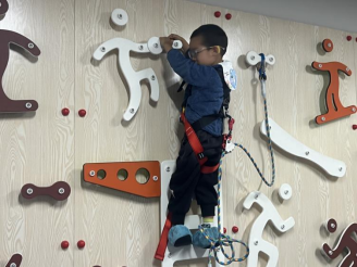 今天晨锻的时候,孩子们来到了二楼玩攀爬游戏,“我要爬上去!”“这个好高呀!”晨光选择了在室内攀爬区的游戏活动老师协助他带上安全绳后他就迫不及待的开始攀爬了。他双手交替抓握攀爬点,双脚踩稳支撑点,一步一步向上移动。在攀爬过程中,晨光表现出较好的身体协调性和平衡能力,能够根据攀爬点的位置调整身体姿势。经过持续的努力,幼儿成功攀爬到了攀爬墙的顶端,脸上露出了自豪的笑容。在游戏中,晨光也能较好地遵守规则,有序地进行攀爬。