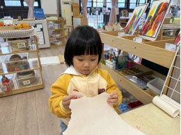 幼儿来园后选了美工区,自主走到了美工区坐下,先是拿了一张纸,看了一眼架子上的照片,低头看看手里的纸,又问了我:“我要撕这个。”幼儿说完自己点点头,然后双手捏住纸张边缘,沿着纸撕出不规则形状,先是轻轻地撕一下,接着又沿着刚才撕的纹路继续撕,手指用力均匀,还调整撕纸方向,逐步撕出类似树的片状材料。一边撕一边说:“这个是我撕的,这个是一个大大的树。”大概这样子撕了三四张纸,又说:“这是一个小的。”随后,幼儿将撕好的橙色纸片粘贴至相框内,拿了一个棕色的蜡笔,卷出了蜡笔头,在橘色纸片上添画圆圈、线条等细节。