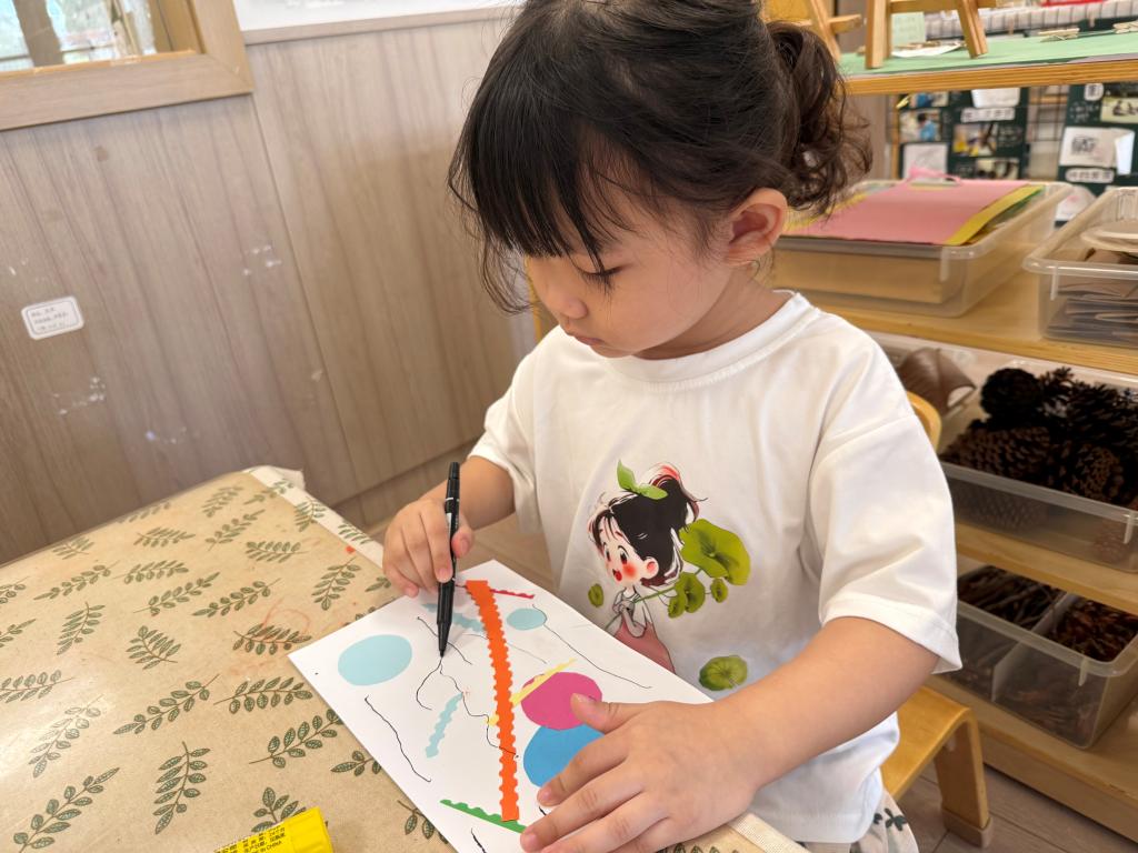 婷婷早上自主选择进入美工区,她先在材料架上挑选了彩色卡纸、记号笔、胶棒等材料,随后坐在美工区的小桌前开始创作。