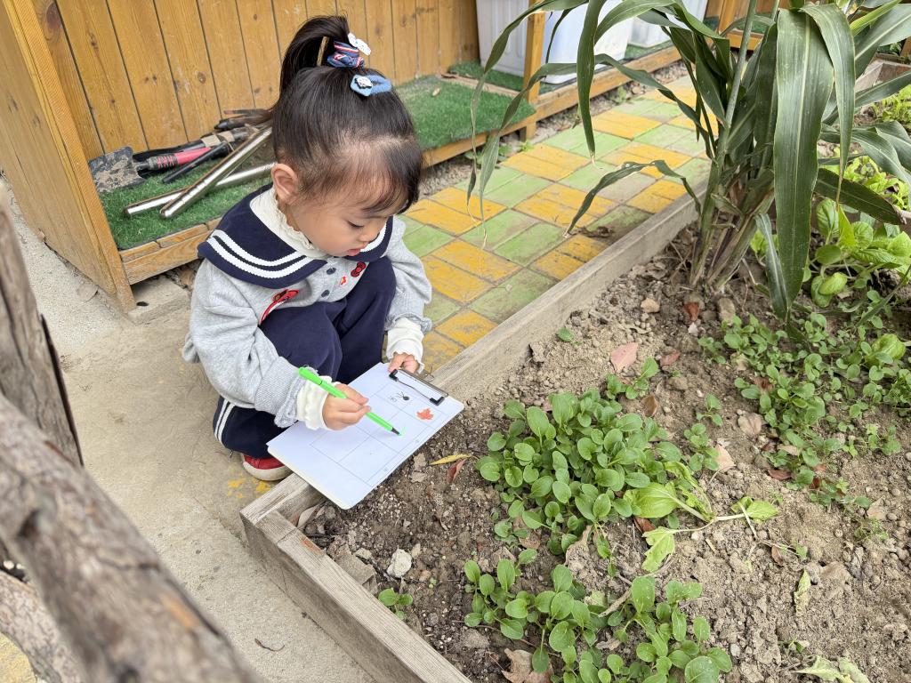 源源来到种植园地后,首先被架子上的黄瓜藤吸引,伸手轻轻摸了摸黄瓜的叶子,嘴里念叨:“这个叶子滑滑的。” 接着,她走到旁边的白菜地,蹲下来仔细看了看,用手指着叶子边缘说:“这个叶子边上有好多小牙齿。”