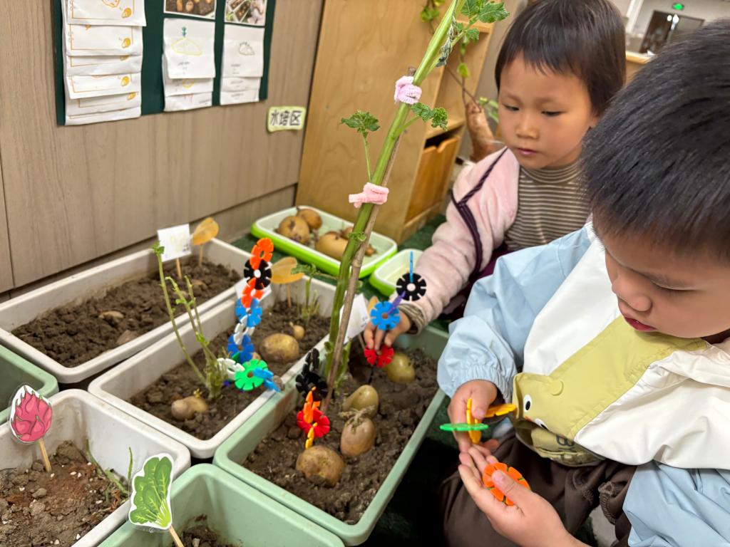 种植区的土豆芽又冒出了新模样,中一班的宁宁和小余捧着一筐插塑积木,兴致勃勃地蹲了下来。