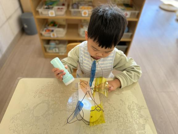 燊燊进入科探区后,立即被桌上的彩色透明纸和手电筒吸引。他先拿起红色透明纸,放在手电筒前端,打开开关后,惊奇地发现墙上出现了红色的光斑。接着,他换了一张蓝色的透明纸,光斑变成了蓝色。燊燊不断更换不同颜色的纸,每次变化都让他露出兴奋的表情。随后,他开始尝试将两张不同颜色的纸叠在一起,比如红色和黄色,并惊喜地发现光斑变成了橙色。他还移动手电筒的远近,观察光斑的大小变化,并尝试在光斑下摆动自己的手,制造出手影。在整个过程中,燊燊神情专注,不断尝试新的组合方式,并主动向教师展示他的发现:老师你看,红色和蓝色变成紫色了!