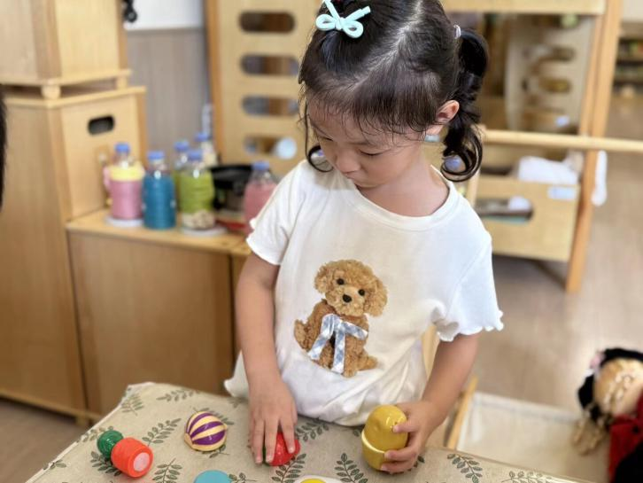 游戏开始后,澄澄径直走进了“星星家”,对着正在摆弄餐具的同伴说:“我是妈妈,我来给宝宝煮面面吃。”她先是像模像样地抱起娃娃,轻轻拍哄,嘴里哼唱着“睡觉觉”,然后将娃娃安稳地放进摇篮。随后,她走到小厨房灶台前,拿出小锅和玩具面条,专注地进行“煮面”游戏,她会用勺子搅拌,并做出“加调料”的动作,自言自语道:“要加点青菜和鸡蛋,营养好。”整个游戏过程持续了近10分钟,她完全沉浸在“妈妈”的角色中,行为连贯且富有生活气息,并能主动与同伴进行简单的角色对话和协作。