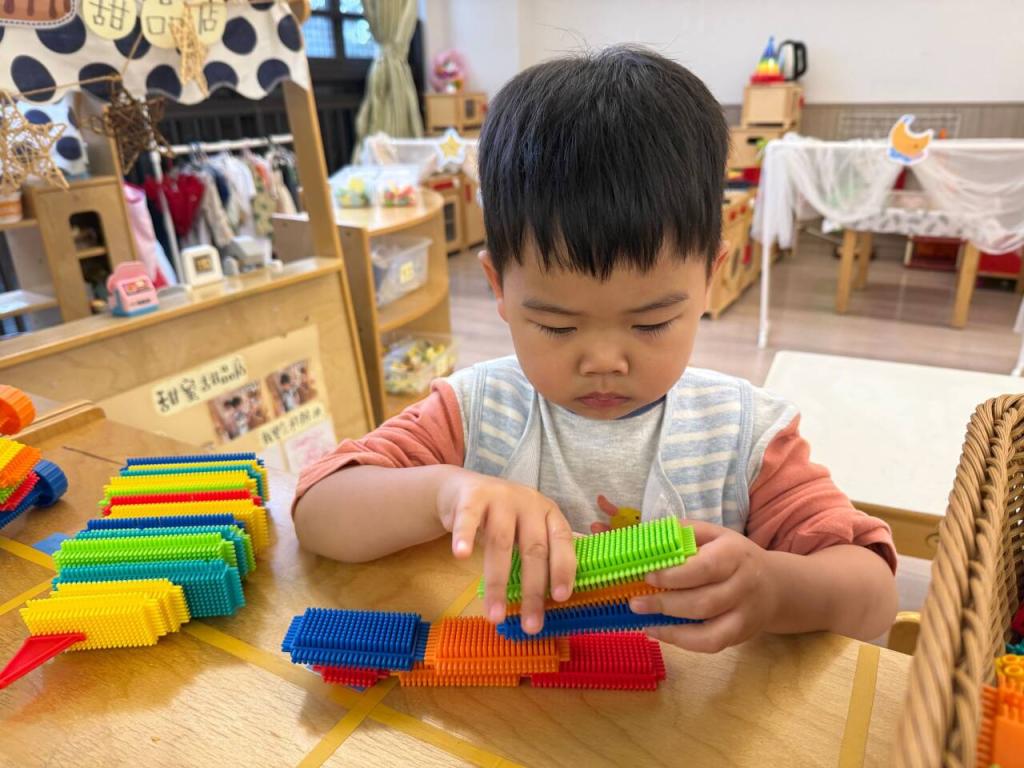 区域活动时,燊燊主动走向建构区,选择了柜面上的刺猬积木材料。他先拿起一个圆形底盘,仔细将彩色的刺猬积木和另外的长方形积木拼插在一起,动作较为专注。过程中,他尝试将不同颜色的积木间隔排列,并轻声说:“有小刺。”当发现有些积木插不牢固时,他会用手按压固定,继续添加其他形状的积木。完成一个作品后,他又拿起另一个底盘,开始尝试对称排列颜色的方式。整个活动持续约7分钟,期间他没有离开座位,表现出较好的任务坚持性和初步的规律意识。
