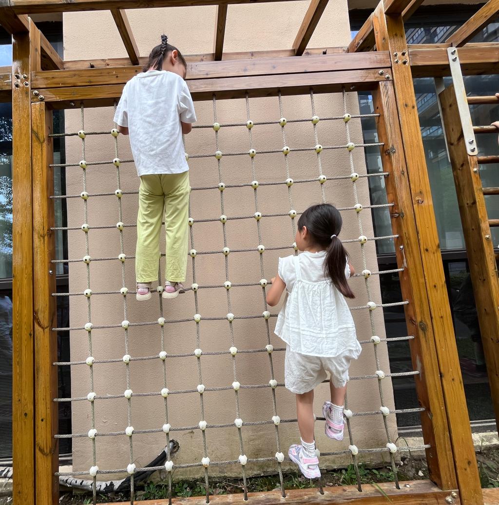 户外活动时间到了,熙熙和好朋友都选择了去攀爬架玩耍。只见熙熙灵活地抓住架上的网,双脚稳稳踩住下面的网格,手脚并用灵活地爬上了顶端。接着,她又用相同的方式小心翼翼地爬了下来,顺利回到了地面。旁边的艺昕看到了,也想尝试,但是有些犹豫,迟迟不敢上去。熙熙看到后,笑着对艺昕说:“别害怕,抓住网就行了,爬上去一点都不难,可好玩了!”在熙熙的鼓励下,艺昕终于决定试试看。她小心地一步一步爬上去,双手抓得紧紧的,但快到顶部时,艺昕有些紧张,想要停下来。熙熙察觉到她的担忧,温柔地说道:“没事,慢慢往上爬就行。”