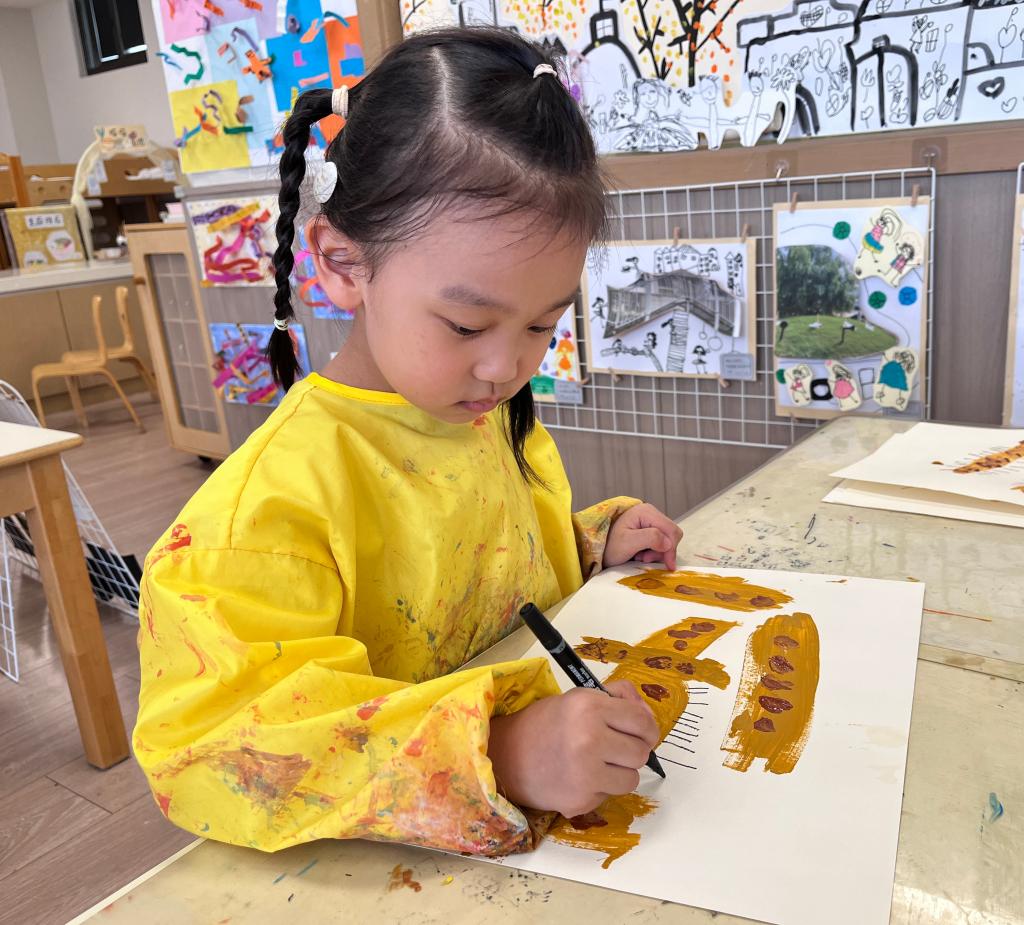 《指南》艺术领域中指出:“幼儿具有初步的艺术表现与创造能力。”在写生山药的时候,熙熙能主动观察山药的外形和细节特征,通过看一看、摸一摸感知山药的外在特点并尝试用不同颜料表现,说明她具备了对事物外形的感知能力和初步的艺术表达意愿。在点画斑点时,她也能根据实物调整斑点的大小和位置,并根据自己观察到的用勾线笔添画山药的细节(身上的毛),展现出其一定的观察判断力和细节表现力。同时,她在创作的过程中也愿意与他人交谈,清楚地说出自己想说的事。