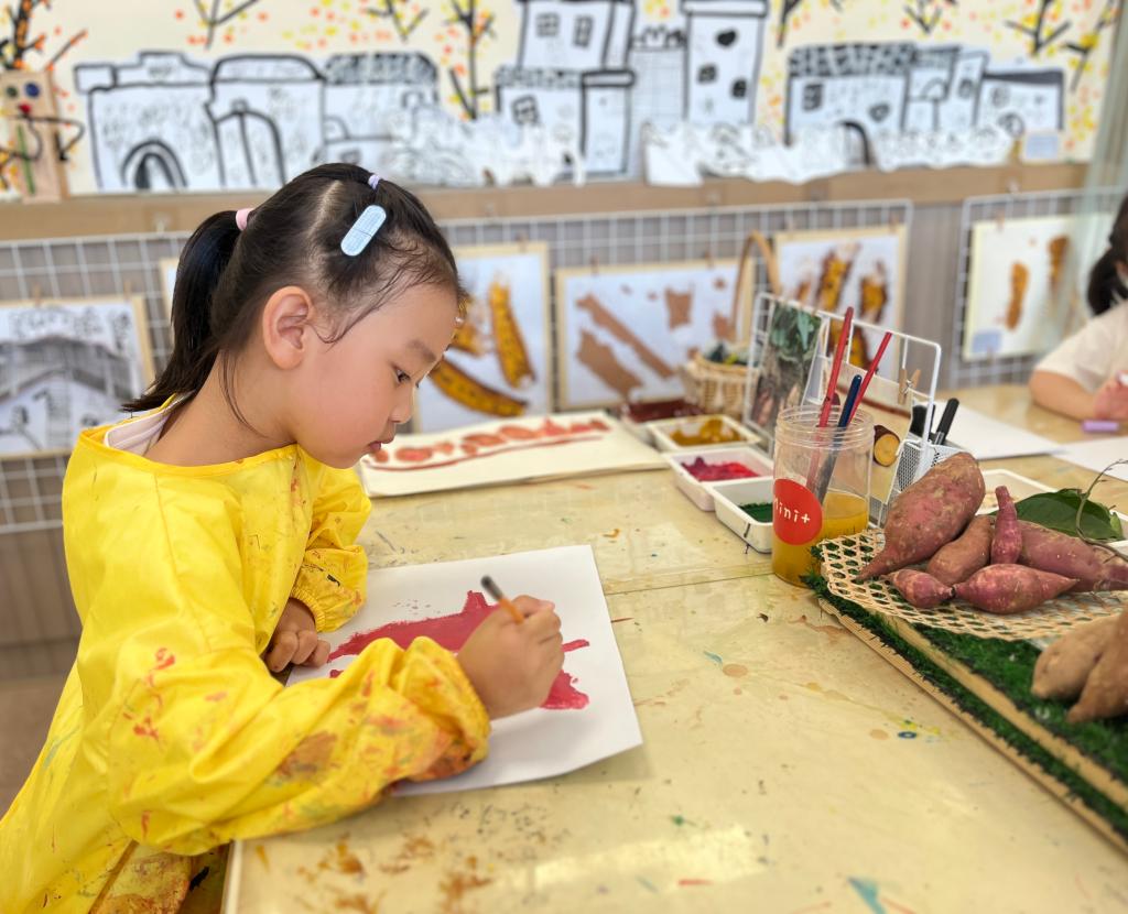 在这次的区域游戏活动中,熙熙选择到美工区去写生红薯。她先是把红薯放在自己的面前,仔细地观察着,发现红薯的外形不像山药那样规则,红薯的身体上是有凸起和凹陷的。接着,她拿起画笔蘸取了橙红色颜料,在画纸上从红薯的顶部开始画,表现红薯凸起的地方时就向上弯曲线条,凹陷处则向下画,慢慢勾勒出红薯的不规则外形。画好外形后,她回忆了上次画山药添画毛毛的经验,在红薯旁边添画了褐色的泥土和几片黄色的小叶子。在绘画中,她还会用手指蘸取少量颜料,在红薯表面轻轻按压,呈现出红薯表面粗糙的质感。