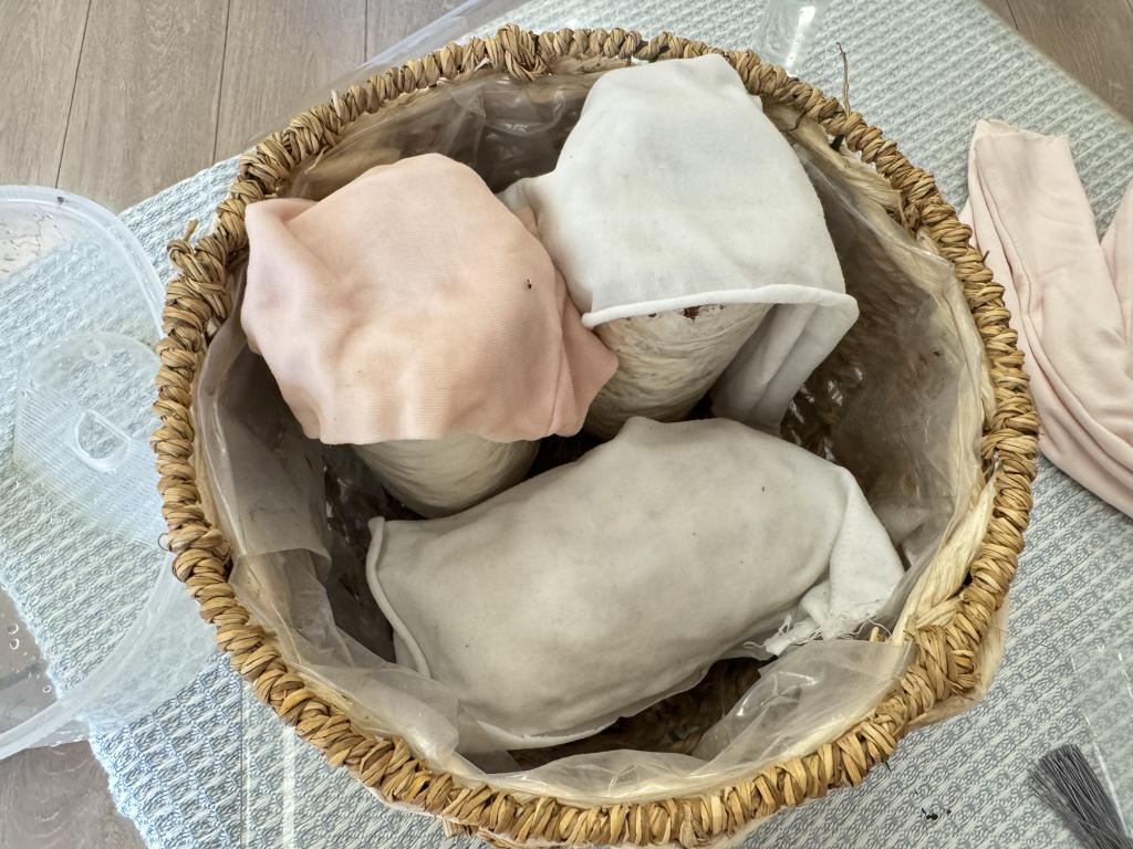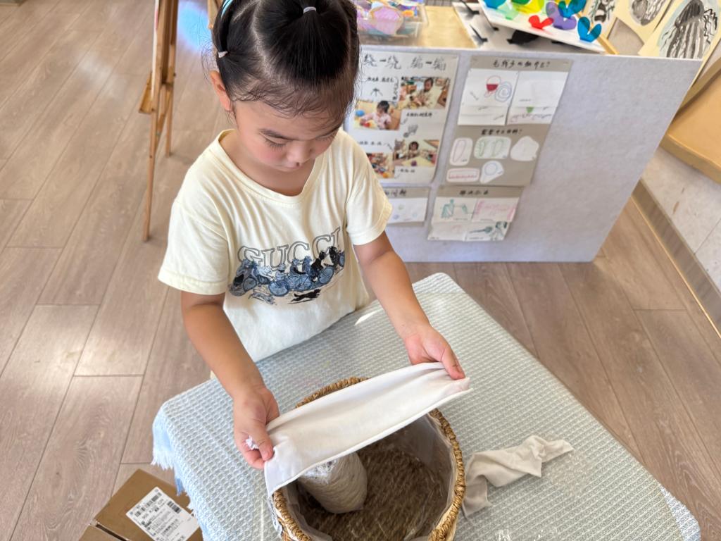 区域活动时,周妤主动选择种植蘑菇。她先双手捏住蘑菇种植盒边缘,慢慢拆开包装,过程中多次调整手指力度,避免损坏内部菌包。接着取来小毛巾,在水龙头下反复揉搓使其浸湿,随后将湿毛巾平整铺在菌包表面,还轻轻按压毛巾边缘确保贴合。最后拿起小喷壶,对准毛巾均匀喷洒,每喷3-4下就停顿观察毛巾湿度,发现局部干燥后又针对性补充喷水,整个过程专注且有条理,完成后还小声对蘑菇说:“你要好好长大呀。”