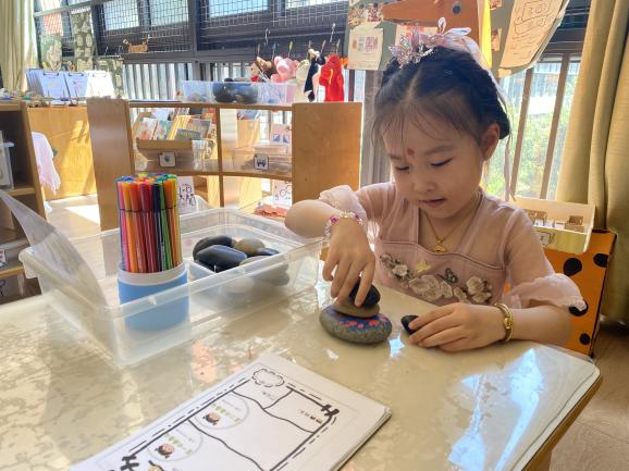 今天萱萱来到了益智区她拿到了一筐石头叠叠乐的游戏,她看了看游戏提示卡,她说:“老师这个是不是把石头一个一个叠起来,比比谁叠的高?”我说:“可以呀,我们来试试看吧。”于是,萱萱就尝试着把石头叠起来,一开始她拿了一块小小的石头,她往上面继续放石头,等放到第四块石头的时候就倒下来了。我便问萱萱“你觉得为什么放了四块石头就倒下来了?”她说:“我也不知道呀,我再试试。”我也一起试一试了,我选了一块最大的石头放在最下面,我放到第五块石头还没有倒。萱萱还是随意拿了一块石头放在最底下,没等到放第四块就倒下来了,这时萱萱就观察到我最下面的石头比较大,于是她再一次尝试了。萱萱选了一块最大的时候放下面,她小心翼翼地往上放一直放到第六块石头都没有倒。