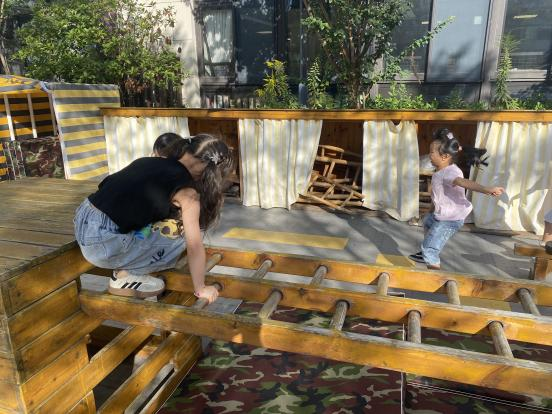 今天的晨锻活动又来到了中庭西梯子组合,萱萱一开始在一根斜斜的木板上往上爬,由于木板比较倾斜,萱萱快爬到上面的时候就掉下来,于是她又尝试了一次,这次爬的速度比较快,她成功爬到了木箱子上。她在木箱子上待了一会,我说:“萱宝,往前爬呀。”她就蹲着往前爬,她往前爬了两步就不动了。我问:“你怎么不往前爬了呀?”萱宝说:“我害怕。”我说:“你可以试试这样,屁股坐在梯子上,脚往前放,这样眼睛不看着下面就不害怕了。”萱宝就这样尝试了一下,慢慢地爬到了第二个木箱子上了。