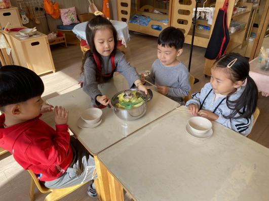 ⒉丰富游戏情境:借此契机,共同制作一张“锅底选择单”,配以图片和简单文字如“辣锅”“清汤锅”,将她的创意成果可视化,支持其读写前经验的发展,也拓展了数学表征能力。