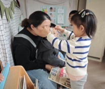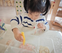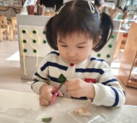 生活区游戏中,希希先打开网袋,用手取花瓣时发现用力捻手上弄到了颜色,便改用镊子夹取花瓣。随后,希希拿起压好的叶子,用剪刀剪成小块装进网袋,又剪下迷迭香枝叶以及掰小的橘皮一同放入,边装边说:“我的香包有花瓣、叶子还有橘皮!”完成后,她拿着香包到其他游戏区,对保育员韩老师说:“你闻闻香吗?有粉色花瓣、黄色和绿色叶子,好看吗?”得到老师肯定后,希希笑着继续向同伴分享,还演示给祺祺看怎么做香包,要放花瓣还可以放减小的叶子。
