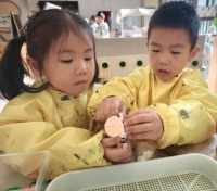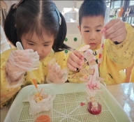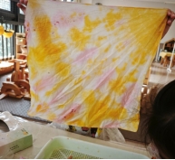游戏开始后,小洲、希希、芸芸将减小的栀子果以及粉紫色花瓣放入石臼中敲出汁液准备扎染。小洲尝试用橡皮筋捆布时没绑紧,芸芸帮忙按住布,发现绑得太松后,老师参与游戏并演示“多绕几圈”的方法后,小洲和芸芸再次缠绕皮筋绑紧。希希提议用夹子夹布边缘,三人分工:芸芸折叠扭转布料,小洲用夹子固定,希希用滴管蘸取粉紫色、黄色的汁液染色。染好后,希希剪断橡皮筋、取下夹子,展开花布说:“你们看,黄黄的粉粉的多好看!”其他幼儿拍手应和纷纷说好看。