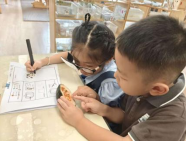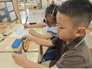 区域游戏开始,晨晨和泽泽抱着南瓜来到科探区,晨晨先伸出手摸了摸南瓜表面,大声说:“泽泽,你摸摸,南瓜皮是粗糙的!”泽泽也伸手摸了摸,接着凑近南瓜闻了闻:“还有点香香的味道呢。”然后两人拿起“南瓜研究记录”表,晨晨指着表上的选项说:“我们的南瓜是橙色的、大大的、粗糙的,快打勾!”泽泽赶紧拿起笔在对应的圆圈里画勾。接着他们开始数南瓜的条纹,晨晨数一条,泽泽就跟着数,数到“8条”时,两人都很确定。然后他们合力切开南瓜,看到里面的南瓜籽,泽泽兴奋地喊:“好多籽呀,我们来数籽!”两人一颗一颗地数,数了好一会儿,最后记录下“25颗籽”。最有趣的是测量南瓜高度,晨晨拿来积木,一块一块地叠在南瓜旁边,泽泽在旁边帮忙数:“1、2、3、4、5,哇,南瓜有5块积木高!”记录完后,晨晨还说:“原来南瓜这么有意思,又能看又能摸,还能和积木比高!”  |
