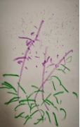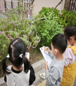 散步时一末、希希、锤锤、米乐等带着记录本随看随画,一末、希希来到鼠尾草面前,一末摸了摸花枝说:“这个长长的像尾巴!”希希接着说:“是紫色的尾巴!”两人随即在纸上画起来了:一末用紫色长线条画花枝,再以紫色小短线在长线两侧画花瓣,之后用绿色小短线画细长叶片。另一边锤锤和米乐在观察凤仙花,米乐画出长长的茎、绿色叶片,还在叶间添上粉色花朵。锤锤边画边说:“有粉色和红色的花!”画完后,一末指着记录本说:“这一点一点的(紫色短线)是花瓣,这个长长的(花)像紫色的尾巴”,米乐也介绍说:“你们看小花粉粉的,藏在叶子里”。