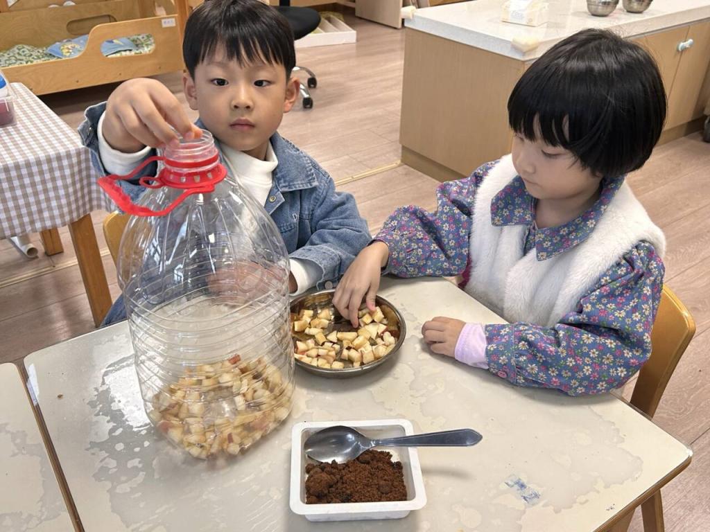 用餐结束后,老师带着墨墨和宁宁,把剩余的苹果块收集起来,还准备了红糖和大塑料瓶。墨墨认真地把苹果块往瓶里放,每一块都小心翼翼;宁宁则在一旁仔细观察,时不时帮着整理。接着,他们又按照老师的引导,加入红糖,再灌满水。
