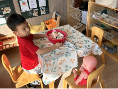 在角色扮演区,蔡米乐今天选择“照顾宝宝”。他先从玩具架子上取来一个红色塑料盆。里面装着一些“食物”,然后将椅子摆好,在把“宝宝”放在了旁边的椅子上。在游戏过程中,发现蔡米乐存在一些问题。他不太擅长与其他小朋友进行互动,当有其他小朋友靠近,想要一起参与游戏时,他会抗拒的说“这是我的”,不太善于和同伴互动;同时他的语言表达相对简单,和“宝宝”一起玩,很少有互动,只有对“宝宝”抱或者放在在推车里跟他一起玩。不过他很喜欢娃娃家,玩的时候很投入,对待宝宝也很呵护!
