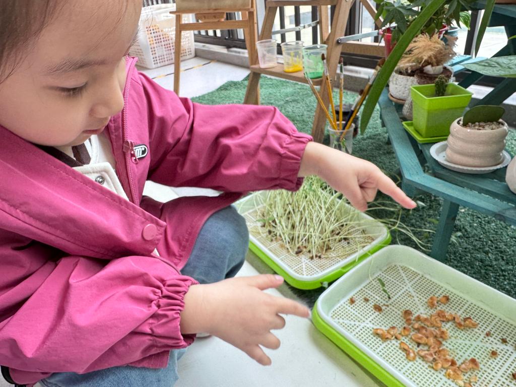 《指南》科学领域支出中班幼儿喜欢接触大自然,对周围的很多事物和现象感兴趣;能对事物或现象进行观察比较,发现其相同与不同;能根据观察结果提出问题,并大胆猜测答案。千也主动关注豆芽生长情况,发现豆芽根、叶子、小芯芯形态特征,还能对比自己种的豆芽与购买豆芽的颜色差异。当发现颜色差异时,千也主动提问为什么不一样?还通过触摸对比两种豆芽的硬度,展现出初步的探究意识和探究方法。同时,千也能够将自己观察到的画面用表征的方式记录下来,愿意大胆交流表达。