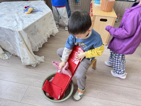 角色游戏开始,恩硕正抱着娃娃坐在娃娃家小椅子上。突然,航航说:“啊,宝宝尿裤子了!”恩硕跑过来查看,他低头摸了摸娃娃的裤子,皱眉说:“湿湿的,尿裤子啦”。随后起身走到柜子前拿了水盆假装在水龙头上接水,取来小衣服和搓衣板,坐在小桌子旁模仿搓衣服的动作,嘴里念叨:“要洗干净才舒服”。搓了一会,他又自言自语道:“没有洗衣液洗不干净,你能帮我去超市买点吗?”于是航航从小超市买了洗衣液给恩硕,恩硕将衣服洗干净夹在了网格架上说:“等它晒干吧。”