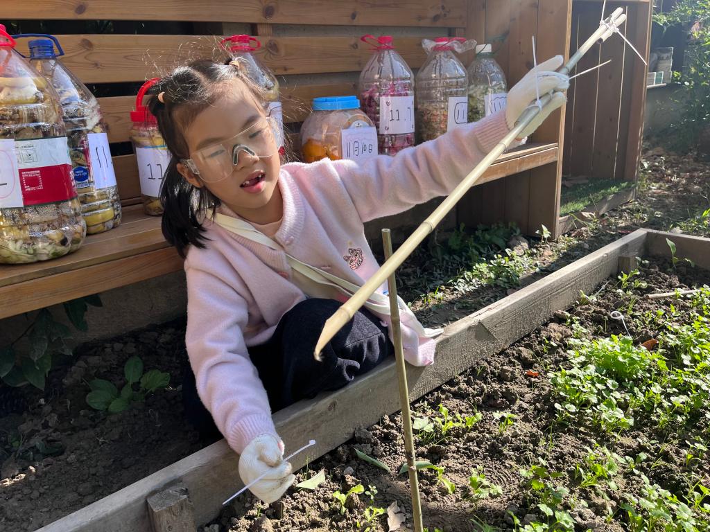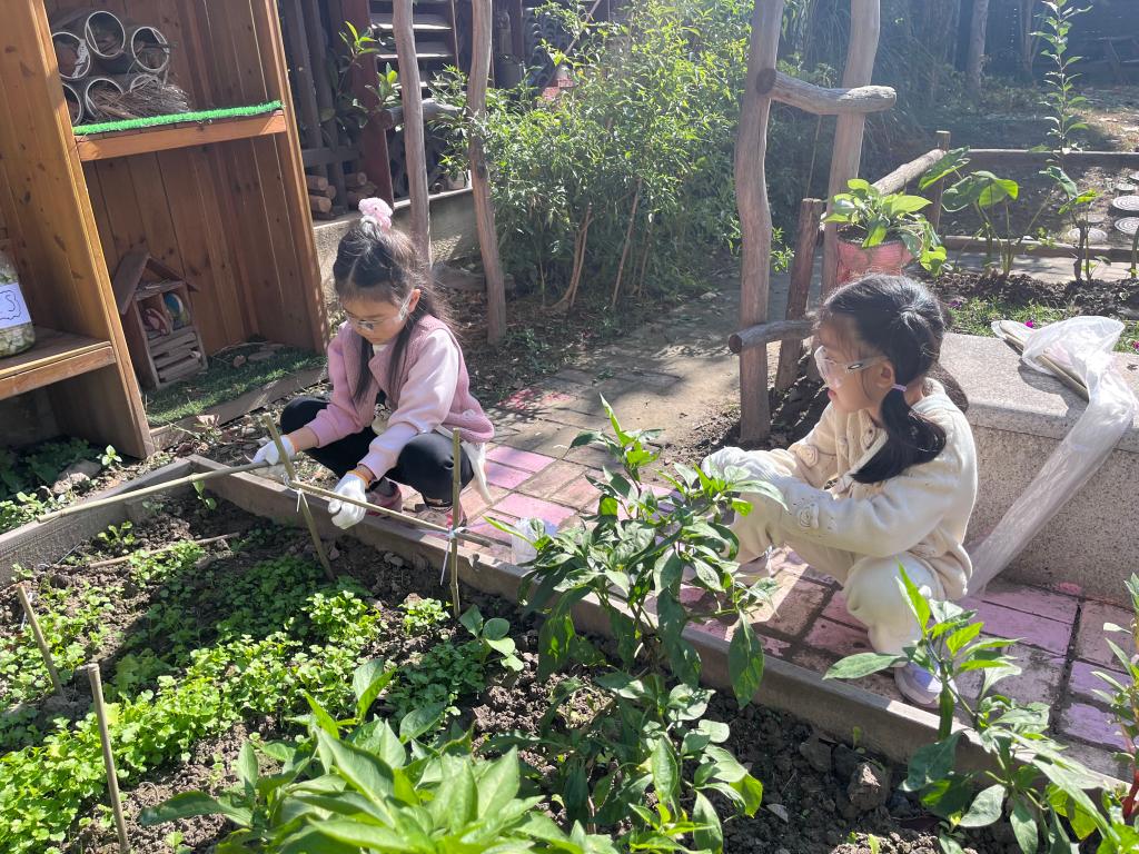 一一、桐桐、芊芊三人戴着白色手套,蹲在种植园地的辣椒苗旁。一一双手各拿一根竹竿,将竹竿分别插在辣椒苗两侧的泥土里,插好后用手轻轻晃动竹竿,竹竿倾斜了,她拔出竹竿重新插,反复调整了三次。桐桐蹲在一旁,左手扶着一根竹竿,右手拿着白色绳子,试图将绳子绕在两根竹竿中间,绳子从竹竿上滑落,她把绳子放在地上,用手摸了摸竹竿,又拿起绳子,将绳子在竹竿上多绕了一圈。