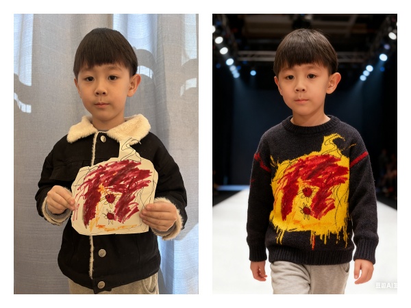 现场实录:今天开展设计毛衣的创意美术活动,晨晨在李老师创意美术的指导下,将自己的毛衣设计成了上面的样子,可以看出他对衣服的轮廓绘画的不是很清晰,在涂色是也没有将颜色涂满,于是我询问晨晨:“为什么颜色涂成这样的红色呢?”晨晨说:“太大了我来不及涂,我也不知道要涂哪些地方。”在了解完晨晨的作品之后,我还是帮助晨晨将设计好的毛衣通过AI软件,将“毛衣穿在身上”,生成好后给晨晨看,晨晨很高兴,还和大家开心的介绍起自己的毛衣:“你们看,我的毛衣穿在身上了,这样子的图案更加好看了。”