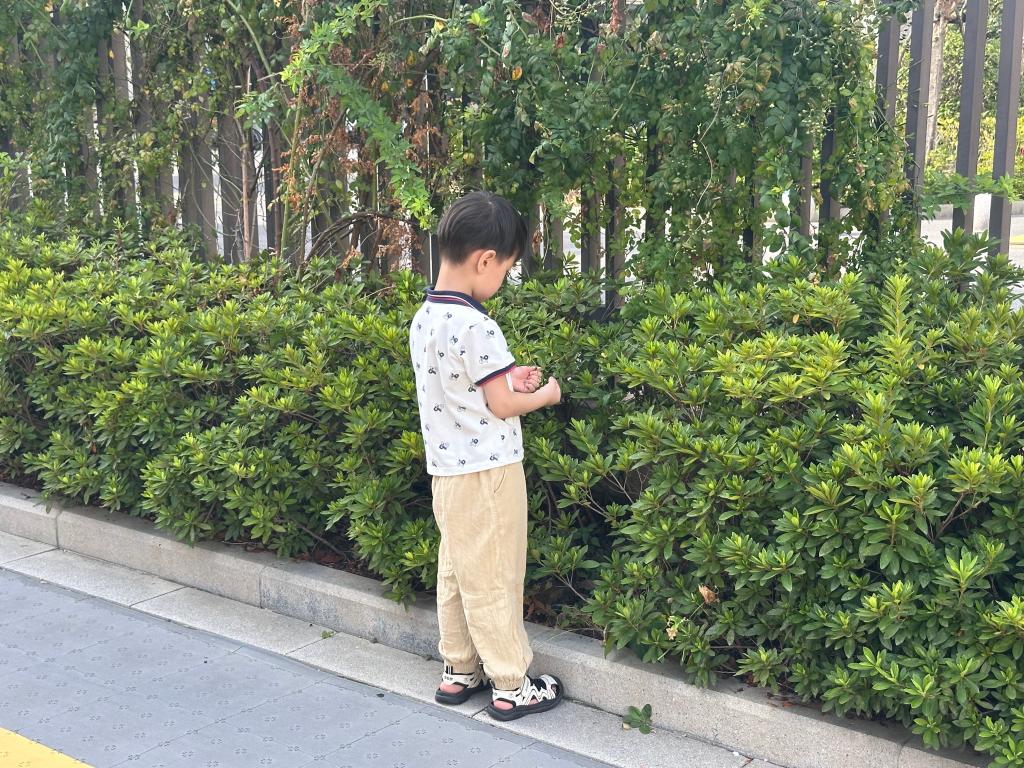 户外晨锻时间,其他幼儿在跑酷区的平衡木和跳台上穿梭玩耍,晨晨独自走到跑酷区边缘的灌木丛旁,蹲下身,伸出手指轻轻触碰叶片,眼睛盯着叶片上的纹路。他捡起一片掉落的叶子,放在手心翻来覆去地看,随后又将叶子放在耳边。