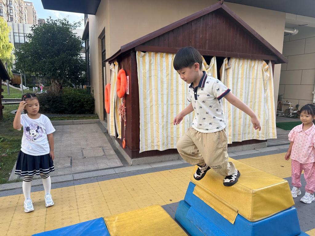 《3-6岁儿童学习与发展指南》健康领域指出,5-6岁幼儿应“能双手抓杠悬空吊起20秒左右”“能助跑跨跳过一定距离,或助跑后单脚向前跳”。晨晨在第一次尝试跳台时,表现出对高度的畏惧情绪(身体后退、反复试探),但在教师的支持下,通过“屈膝-蹬地-跳跃”的连贯动作完成了跳跃,显示出其下肢力量和身体协调性已具备完成该动作的基础能力。第二次独立跳跃时出现身体晃动,第三次则能“稳稳落地”,表明其平衡感和动作控制能力在短时间内得到快速提升,同时也体现出晨晨在面对挑战时,能够通过重复尝试逐步调节紧张情绪,符合“能随着活动的需要转换情绪和注意”的情绪发展特点。