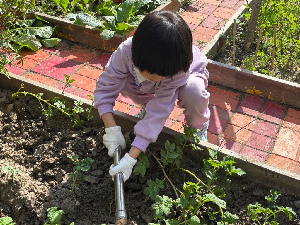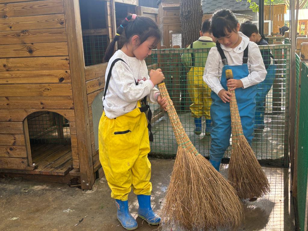 活动中,有的孩子蹲在种植地,稚嫩的拨开土壤,拔掉藏在缝隙里的杂草。有的小朋友专注地观察着泥土的颜色,寻找藏匿在土壤里的昆虫,并和好友分享着自己的发现。有的小朋友穿上防水衣,拿上扫帚,欢快地打扫着鸭舍、鸡舍。