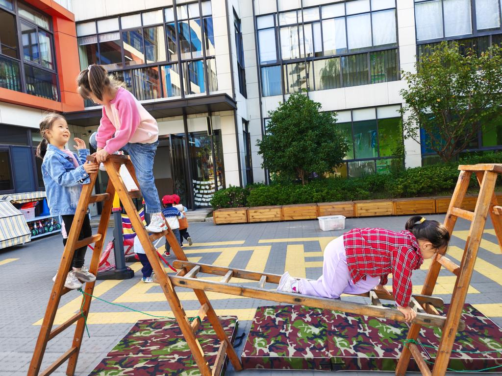 晨锻开始后,洛宝先在器械区观察了一会,随后走向横向放置的梯子,蹲下身用手触摸梯级边缘,确认稳固后,以手脚撑地的跪姿趴在梯级上——她先将右手向前伸,抓住前方梯级,同时左脚向前移动踩住相邻梯级,随后交替移动左手与右脚,缓慢向前爬行。爬至梯子中段时,她的左手不小心搭在了两根梯级的间隙处,身体微微下沉,随即停顿1秒,将左手调整至完整梯级上,同时收紧腹部保持身体平直,调整后继续以“右手-左脚、左手-右脚”的节奏爬行,速度比之前稍慢但动作更稳。爬完全程(约2米长的梯子)后,她立刻转身回到起点,这次调整了准备姿势:以俯趴姿势将腹部贴在梯级上,双手向前伸直抓握梯级,双腿并拢向后伸展,先移动右手与右脚,再移动左手与左脚,尝试“腹部贴梯”的爬行方式。过程中,她的双腿偶尔会碰到梯级边缘,但很快通过弯曲膝盖调整位置,最终顺利爬完,爬完后抬头对旁边的教师露出笑容,随即再次回到起点准备尝试。