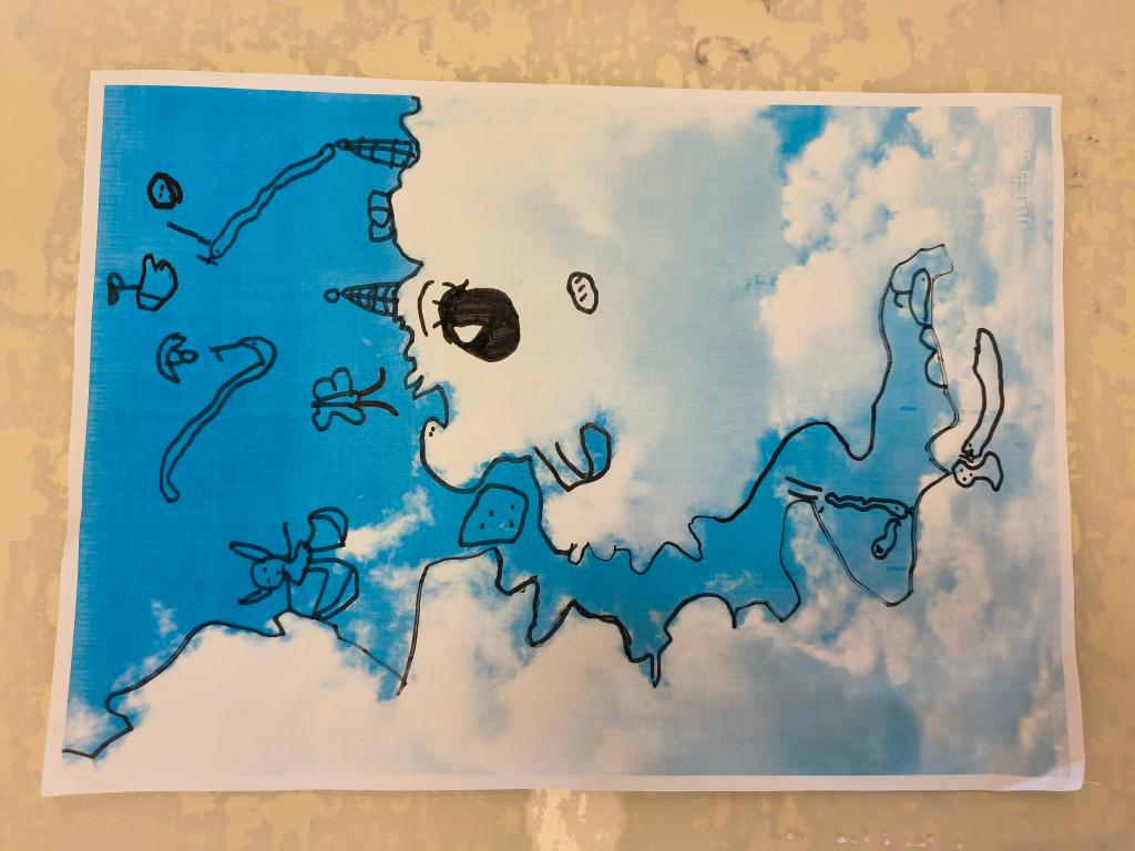 “变变变”主题活动下,我们在美工区投放了不同云朵的图片,鼓励幼儿观察云朵的形象进行想象添画,让云朵“变变变”。区域游戏时,伊伊来到了美工区,挑选了一张云朵的图片。伊伊拿起图片看了一会儿说道:“啊,我觉得这个像年兽,我要画一个年兽!”伊伊拿起勾线笔沿着云朵的轮廓描了起来,然后在云朵中间添画了一个眼睛,伊伊:“看我把年兽的眼睛画出来了,接下来我要画它的嘴巴啦。”伊伊沿着云朵的轮廓画出了年兽的嘴巴。伊伊:“我画完啦。”我:“伊伊你看旁边还有很多散开来的小云朵,想一想也把它们变成有趣的东西吧。”伊伊:“我知道啦,我可以给年兽画一个帽子,还要画一些小礼物,小彩带,给它做装饰,这样就热闹了。”伊伊拿起笔开始添画。
