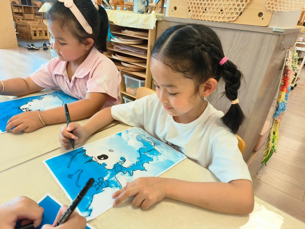 《3-6岁儿童学习与发展指南》艺术领域具有初步的艺术表现与创造能力部分中指出:“能用多种工具、材料或不同的表现手法表达自己的感受和想象。”伊伊通过观察云朵图片,能联想到年兽的形象,体现出较强的联想能力;同时,在在教师的引导下,能围绕“年兽”主题延伸出“帽子、小礼物、彩带”等装饰元素,让创作从单一的形象向场景化内容拓展,让画面变得丰富有趣。活动中,伊伊先用勾线笔沿云朵轮廓描边,绘画出年兽的基本形状,再逐步添画眼睛、嘴巴等关键特征,创作步骤清晰明确。同时,伊伊能通过语言同步表达创作思路,对自己的创作有一定的规划,而非随意涂鸦。在引导下,伊伊能再次观察零散的云朵,进行二次创作,表现出伊伊的创意想象力及思维的灵活性。