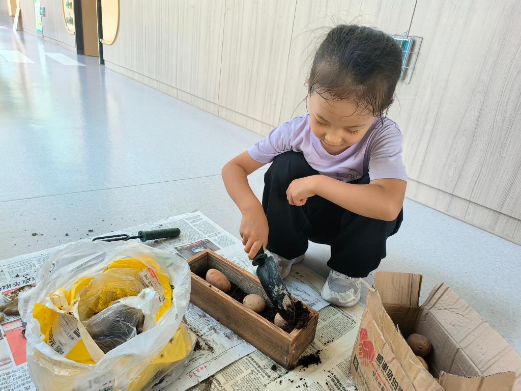 本次活动中,然然展现出了极强的动手能力和专注力,从准备材料到种植操作,每一步都透着对植物生长的探究欲。自然角的土豆种植活动不仅让她直观感知了植物种植的过程,更在她心中埋下了“生命成长”的探究种子。特别是然然在土豆种植中给土豆埋土的时候,她一边埋一边观察,遇到土壤不均匀的地方,还会用小手轻轻按压、整理。这体现然然的专注力、动手能力与责任感,符合幼儿观察“重过程、显个性”的核心要求。