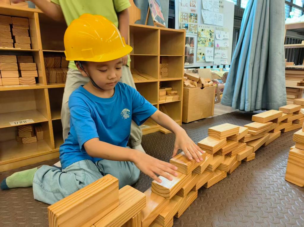 接着,他尝试在“墙”的上方搭建“屋顶”,拿起一块三角形积木放在两块长方体积木中间,可积木刚放上去就滑了下来。豆豆没有放弃,他换了一块较宽的长方形积木横放在“墙”顶,这次积木稳住了。他抬头对旁边的小朋友说:“你看,我搭的天安门的顶!”