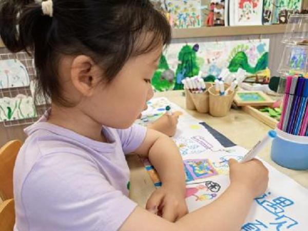 美工区开放后,朱朱快速选择自己常用的绘画位置,有序摆放好彩笔、画纸。她先盯着画纸思索几秒,随即拿起一支亮黄色彩笔,在画纸中间偏下位置,勾勒出一个长方形轮廓,作为画面主体框架。接着,她用紫色笔为长方形描边,让轮廓更突出,还细致地在长方形内划分区域,用蓝色笔填充部分区块,又换绿色、橙色笔,给不同小区域涂色,搭配出色彩丰富的“格子”效果,嘴里嘟囔着“这样像神秘的魔法盒子”。