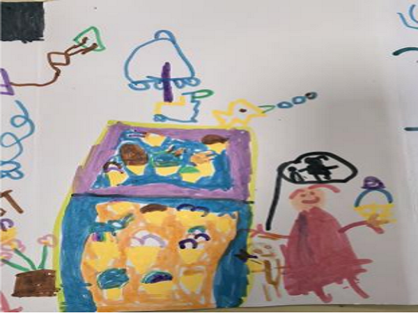 创作中,通过划分区域、搭配色彩塑造主体,添加人物、星星等创意元素,展现出对图形、色彩的感知与组合能力,以及基于想象的艺术创造,契合“能用绘画表现自己观察到或想象的事物,尝试运用不同表现手法”,但反映其艺术表现创造的发展水平。