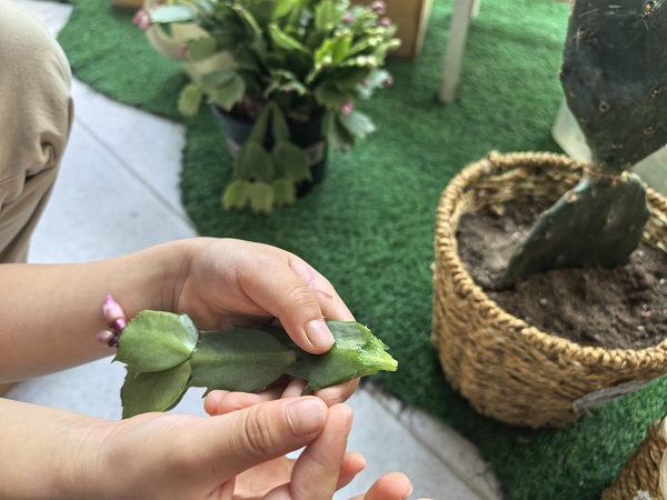 教师发动家长资源,收集到蟹爪兰盆栽后,在自然角给幼儿演示仙人掌与蟹爪兰的“嫁接”。小择看到后,兴奋地说道:“就是把两样东西组装在一起!”演示过程中,教师着重讲解并展示了两种植物接触部位要切开的注意事项。