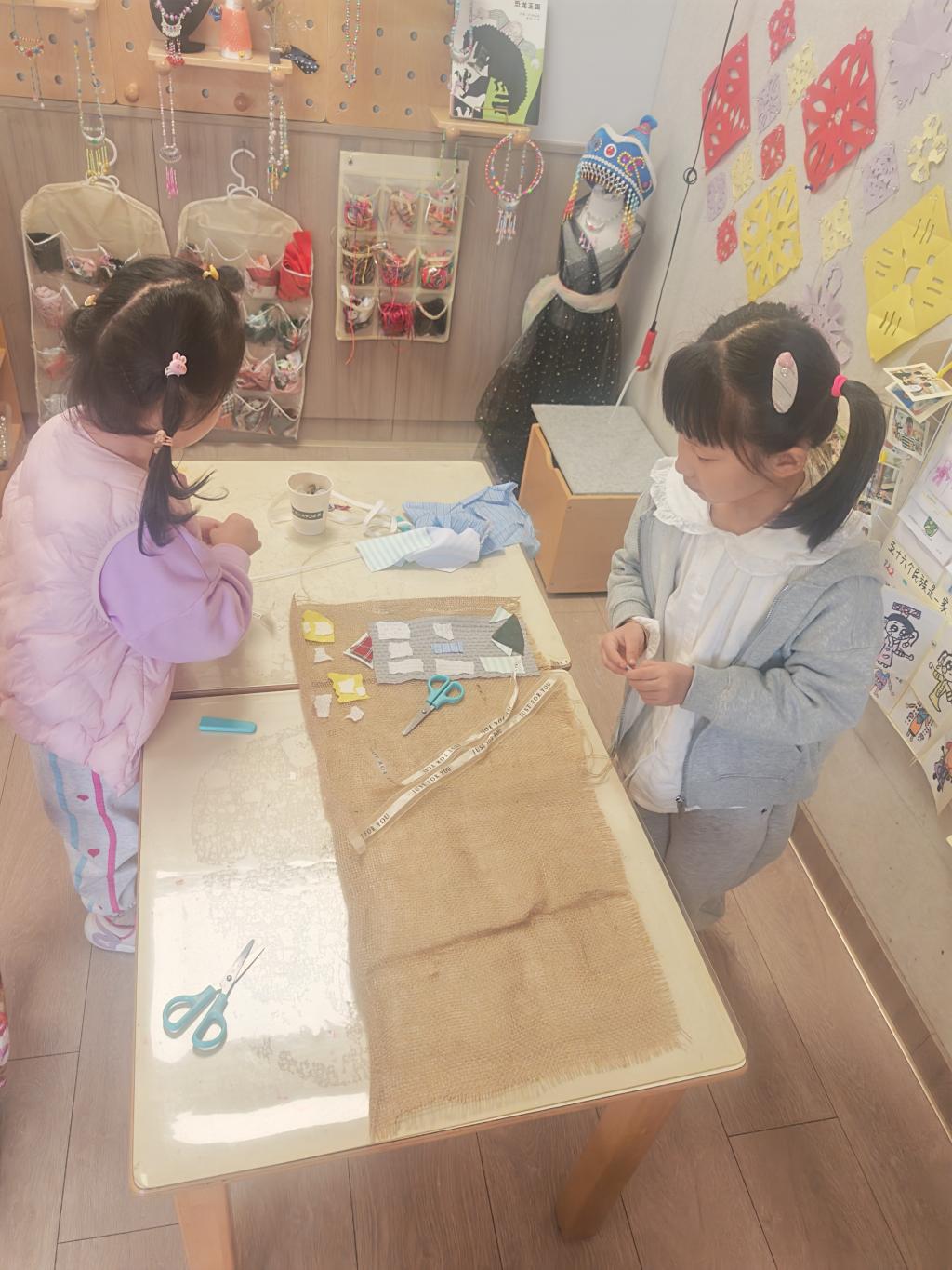 动开始,仪仪、小禾、达达便自发组成小组,围坐在材料桌前讨论创作思路。仪仪率先提议:“我们先画个大概的样子吧,不然布剪得乱七八糟就不好看了。”小禾和达达纷纷点头赞同,三人一同在画纸上勾勒出城市的大致布局——中间是几栋高低不一的房子,下方留出一片空白作为池塘,两侧规划出种植大树和小花的区域。讨论完毕后,三人开始分工挑选材料。仪仪负责挑选房屋的主体布料,她拿起一块浅粉色的棉布说:“这个做屋顶,软软的像小房子的帽子。”小禾则专注于挑选绸带,她选了几条蓝色和绿色的绸带,轻声说道:“蓝色做池塘的水,绿色做大树的叶子。”达达则在一旁整理零散的小块布料,将红色、黄色、紫色的小布块分类摆放,念叨着:“这些小块的可以做小花,五颜六色的肯定好看。”三人相互配合,偶尔会有小分歧——小禾想把池塘画得大一点,达达则觉得要给小花留更多空间,仪仪耐心地协调:“我们把池塘缩一点点,旁边多留些地方种小花,这样城市又有水又有花,更漂亮。”最终,三人达成共识,初步完成了城市家园的布局规划,为后续的剪贴创作奠定了基础1. 合作能力:三人自发组队、分工讨论,初步建立合作关系,仪仪主动提议规划、协调分歧,展现出基础的小组协作意识和初步领导力。