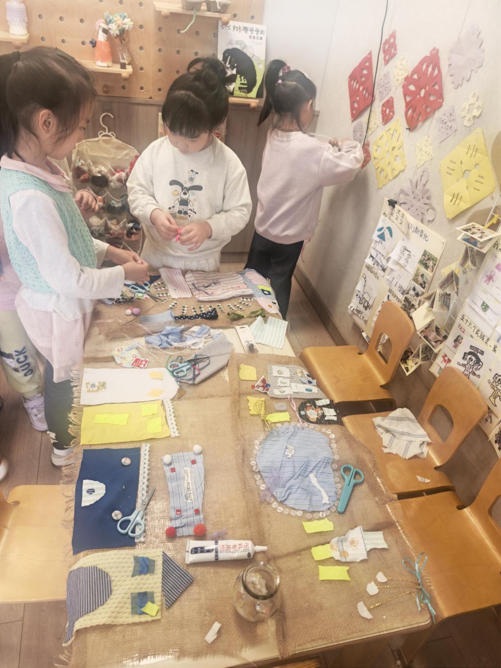 小禾则专注于池塘和大树的创作。她将蓝色绸带剪成细长的条状,一层一层地粘贴在画纸下方的空白处,粘贴时特意留出一些弧度,轻声说:“这样像池塘里的水在流动。”随后,她拿起绿色的大块棉布,剪成不规则的圆形作为大树的树冠,又用棕色的布条剪成长条作为树干,先将树干粘贴在画纸两侧,再将树冠固定在树干顶端,一棵简单的大树雏形就出现了。达达负责辅助两人,并开始尝试剪贴小花。她拿起红色的小布块,剪成圆形作为花瓣,又用黄色的小布块剪了小小的圆点作为花蕊,将花瓣围绕着花蕊粘贴好,一朵小巧的红花就做好了。动手能力:在前期布局规划的基础上,幼儿将构思落地,熟练使用剪刀裁剪不同形状(屋顶、树干、花瓣)、精准粘贴材料,精细动作和动手执行能力得到实践提升。