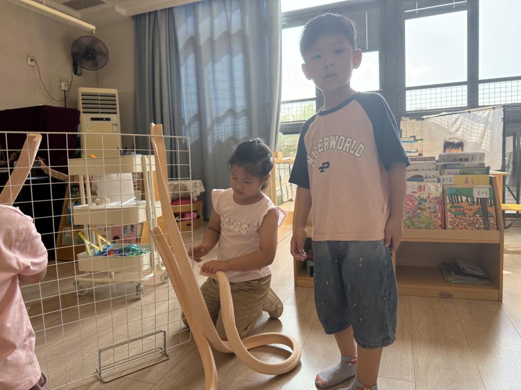 科探区游戏开始,璟璟和予予选择了科探区,这是他们第一次接触“坡道滚球”这个游戏。活动开始,璟璟和予予先仔细观察了防撞条、球和网格架这些材料。接着,予予尝试将防撞条弯曲,想搭建出坡道的形状,璟璟则在一旁帮忙扶着网格架,尝试把防撞条的一端固定在网格架上。第一次尝试时,防撞条没固定好,球滚下来时,防撞条也跟着晃动,球很快就掉了下来。之后,他们又多次调整防撞条的位置,反复试验球滚动的效果,但是都只是单纯的将球从防撞条上滑上滑下。
