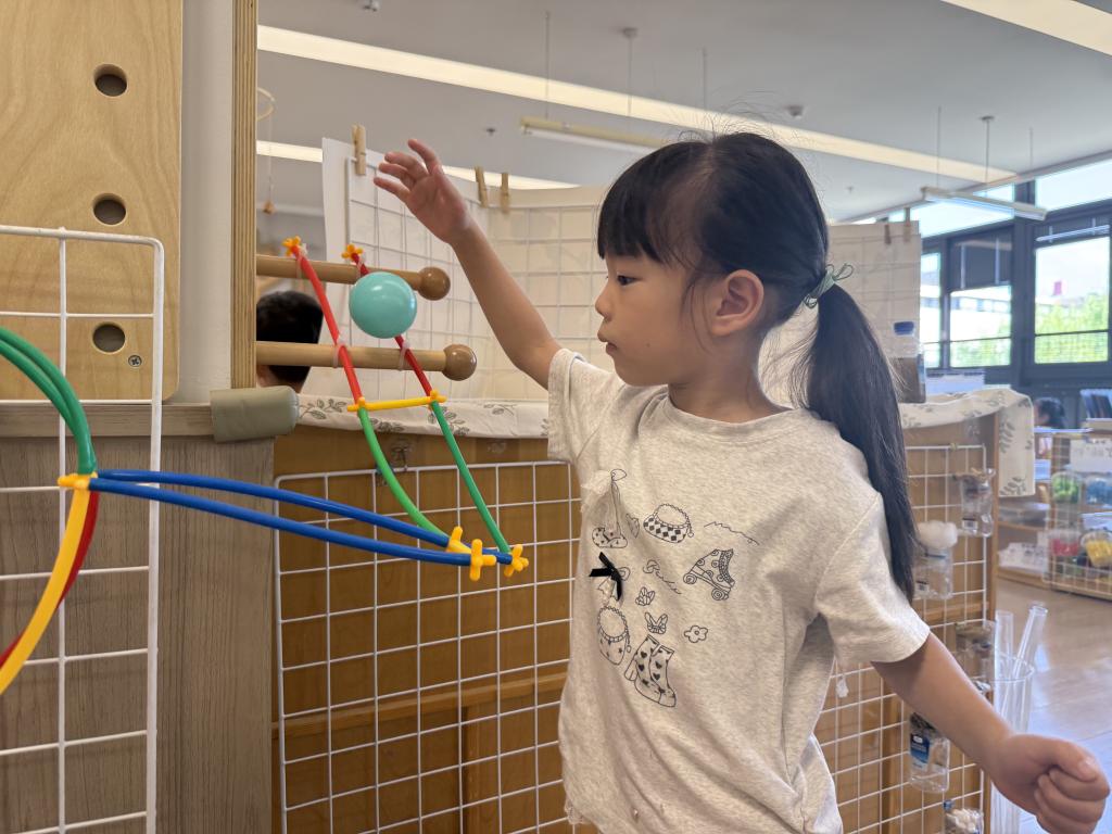 上周墙面的坡道滚球轨道已经搭好,禾禾和予予站在已经搭好的轨道前,开始琢磨起怎么能让球从不同方向滚下去。予予先拿起球,从轨道的一个较高坡度处轻轻放下,球顺着轨道快速滚下。禾禾见状,兴奋地说:“看,球往那边跑啦!”接着,禾禾在另一边放球,球滚动的方向与予予放球时完全不同。两个小朋友眼睛紧紧盯着球,脸上满是好奇与兴奋。他们反复尝试在不同坡度、不同位置放球,观察球滚动的方向变化,还时不时交流着自己的发现,比如“从这个坡度放,球跑得更快”“那边放球,球会往左边拐” 。