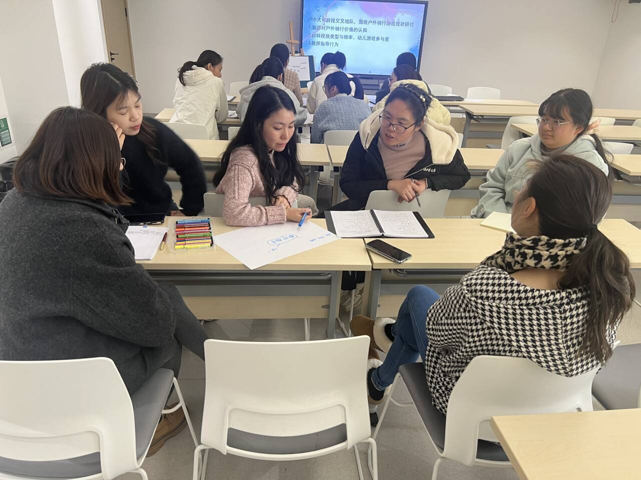 首先,老师们围绕什么是户外游戏各抒己见,共同搭建认知思维导图。随后,跨年龄段分组,从幼儿发展价值、材料投放策略、教师指导方法三大维度,结合小班感知体验、中班技能提升、大班综合拓展的发展特点,分享实践中的困惑与经验。最后,通过理论学习专业文献,进一步明确了以幼儿兴趣为中心,利用周边资源支持理念,补充完善了户外游戏的核心认知。