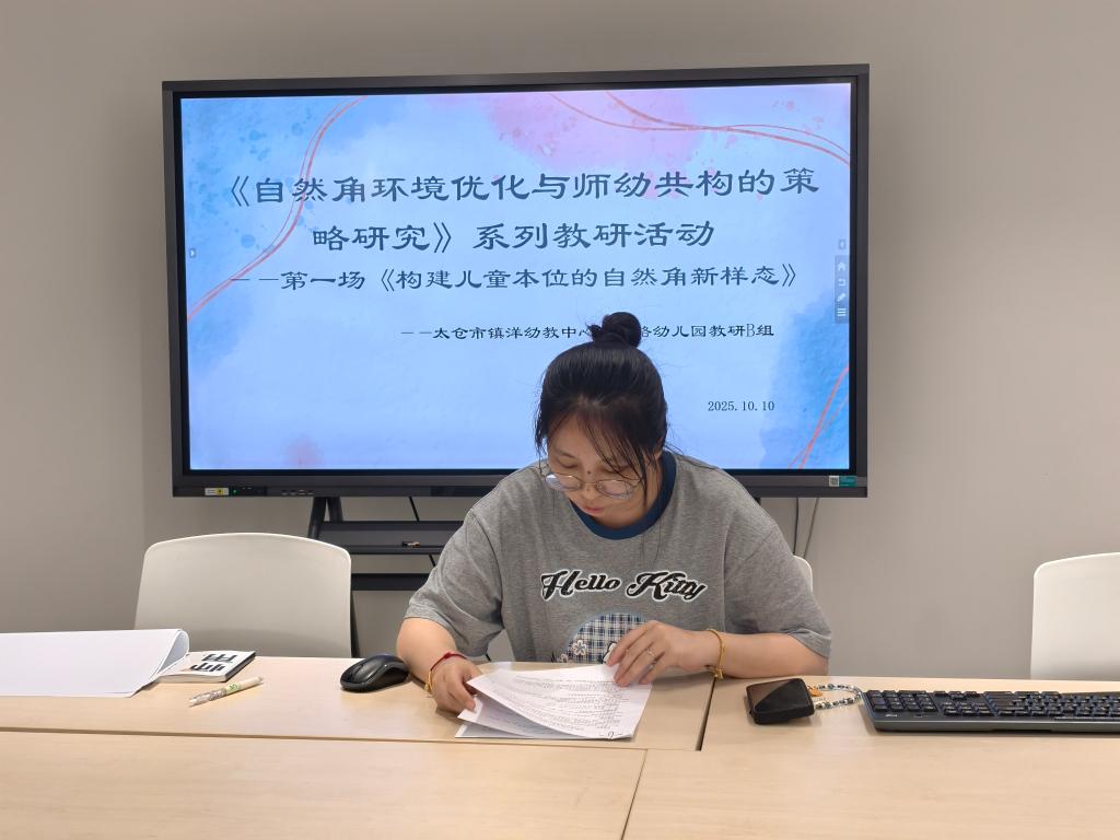 为构建儿童本位的自然角新样态,2025年10月10日下午,太仓市高新区镇洋幼教中心洛阳路幼儿园教研B组开展《自然角环境优化与师幼共构的策略研究》系列教研第一场活动,全体教研组教师参与,李晓菲老师主持本次活动,共计2学时。