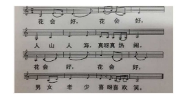 “赶花会”是我国南方流行的民俗文化活动,也是民间音乐的盛会。乐曲《赶花会》是苏少版小学音乐三年级下册中的一首民族轻音乐,其富有中国民族音乐的特点。以动人的旋律和轻巧的节奏生动地描绘了一幅美丽的民间风俗画。教师在音乐活动中充分调动儿童的通感,亲身体验音乐,运用动觉、听觉、视觉的联动,投映到多种音乐活动中。其中从学科共通的角度,感知语言与音符高低起伏的韵律关系。教师从字词发音引导学生关注语言的韵律,从而练习到音高起伏的特点,进而编创歌词。